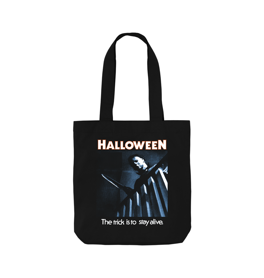 Our OFFICIAL Halloween Trick To Stay Alive Graphic Black Tote Bag based on the popular film features a printed design on the front. This quality garment is manufactured officially under license by Park London on behalf of Halloween.