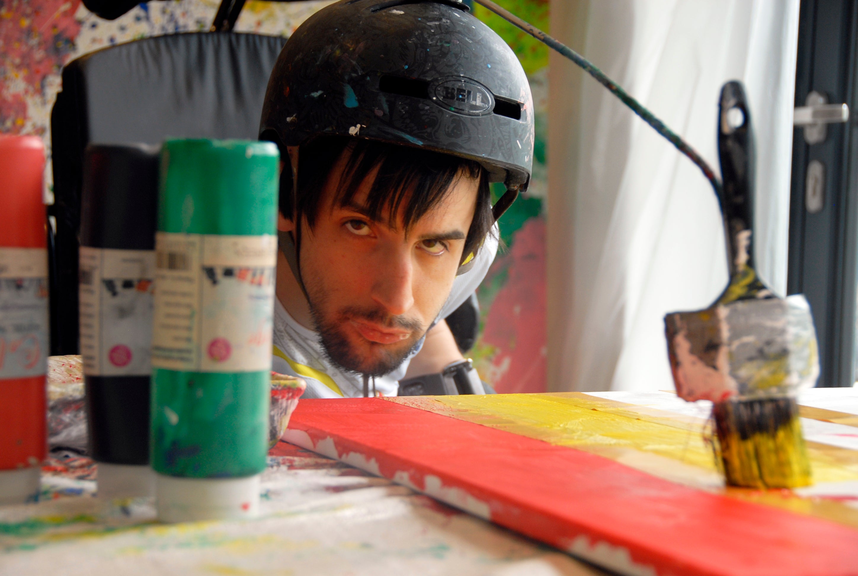 Michael (also known as Stigy) attended an art and design course where he discovered that when he painted he could express himself without limitations for the first time. He uses a few techniques to create pieces, including an adapted helmet with brushes attached.