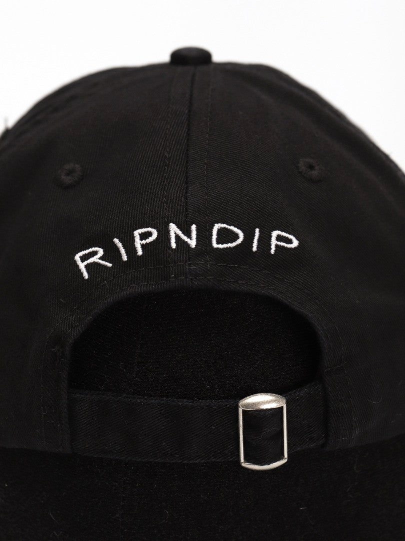 Cotton twill peaked hat with embroidered image on the front and RipNDip logo on the back. Features a curved peak and adjustable strap at the back.