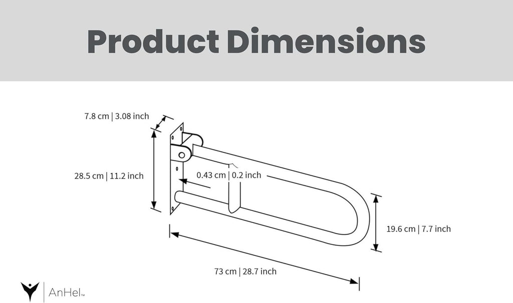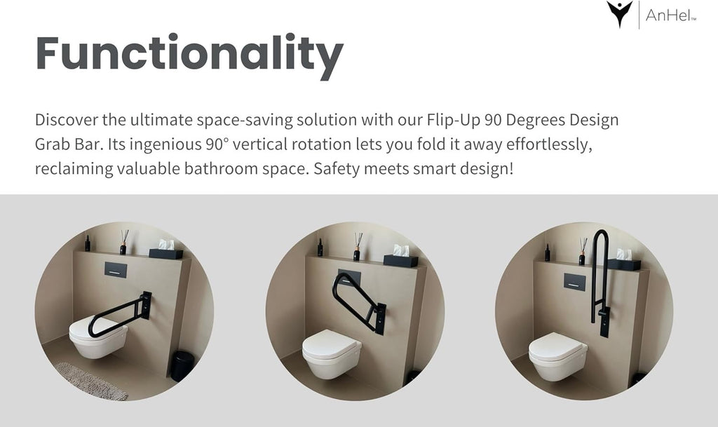 ANHEL 29” Stainless Steel Bathroom and Toilet Grab Bar - Foldable, Flip-Up, U-Shaped, Anti-Slip with Textured Grip, Screw-in for Elderly, Support, Black Finish