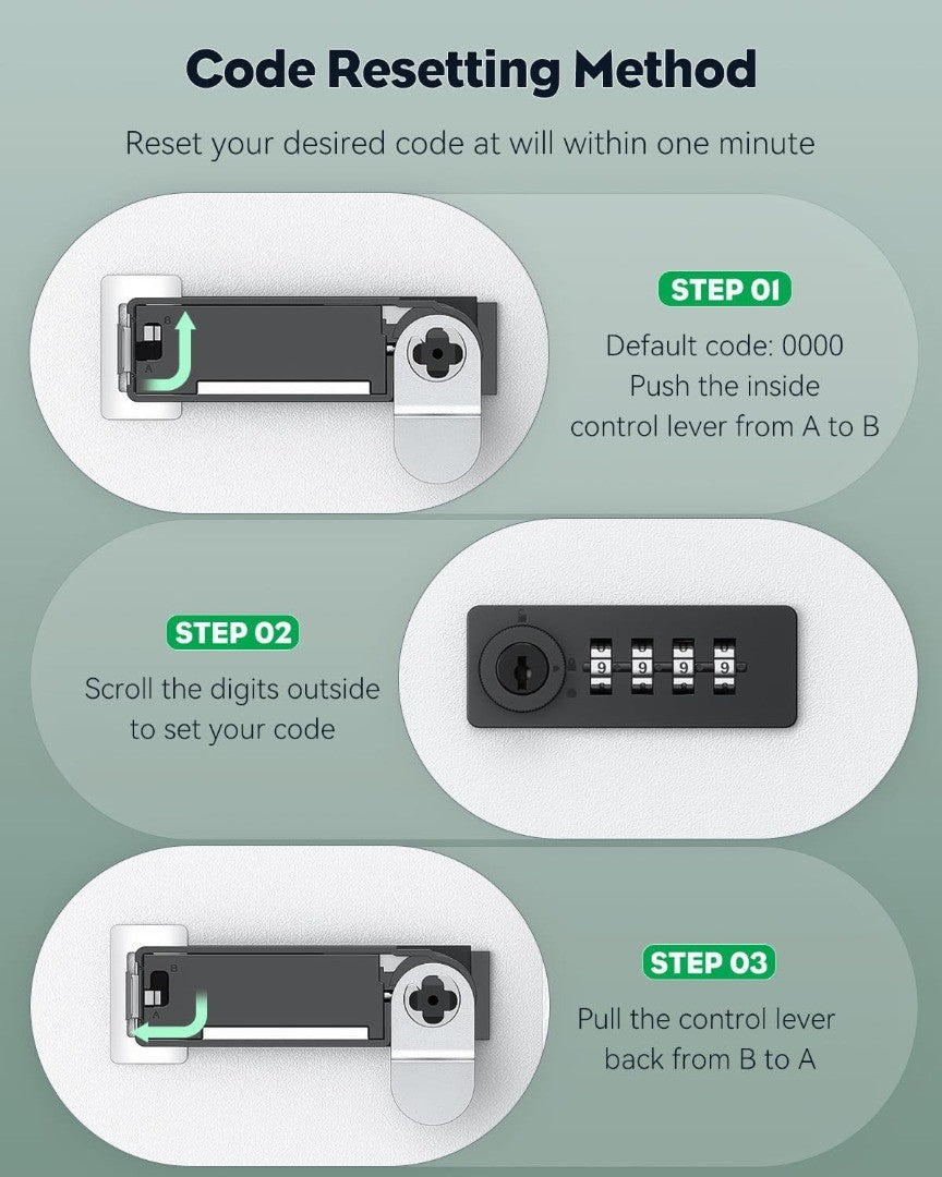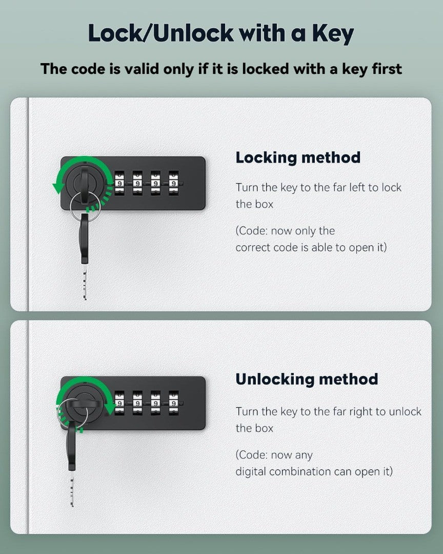 Locking Methods: Code: turn the knob right first and scramble the digits. Key: scramble the digits first, insert the key and turn it to the far left. (Notice: It must be locked by the key first, otherwise it can be opened even with a wrong code.)