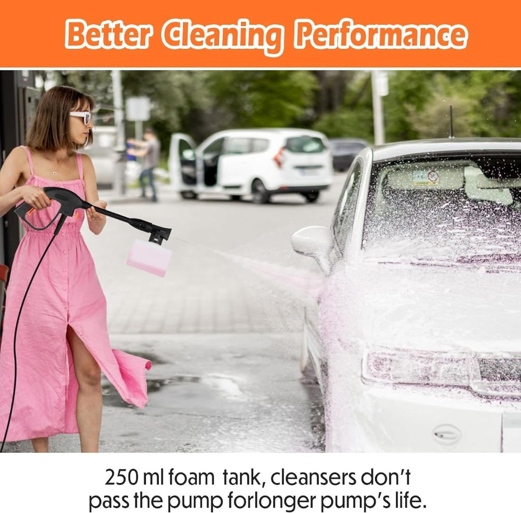 On-Board Storage --- High-pressure lance, trigger gun, foam sprayer, mains cable, and accessories all be stored neatly on the machine. The all-in-one power jet washer comes with a 5 meter power cord and 5 meter pressure hose, a 250ML foam jug and can clean most areas of your garden.