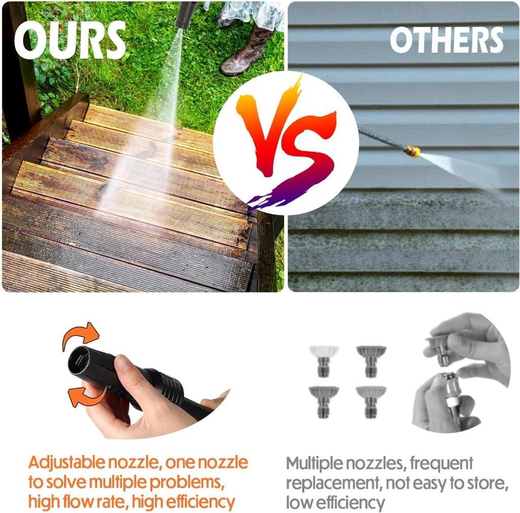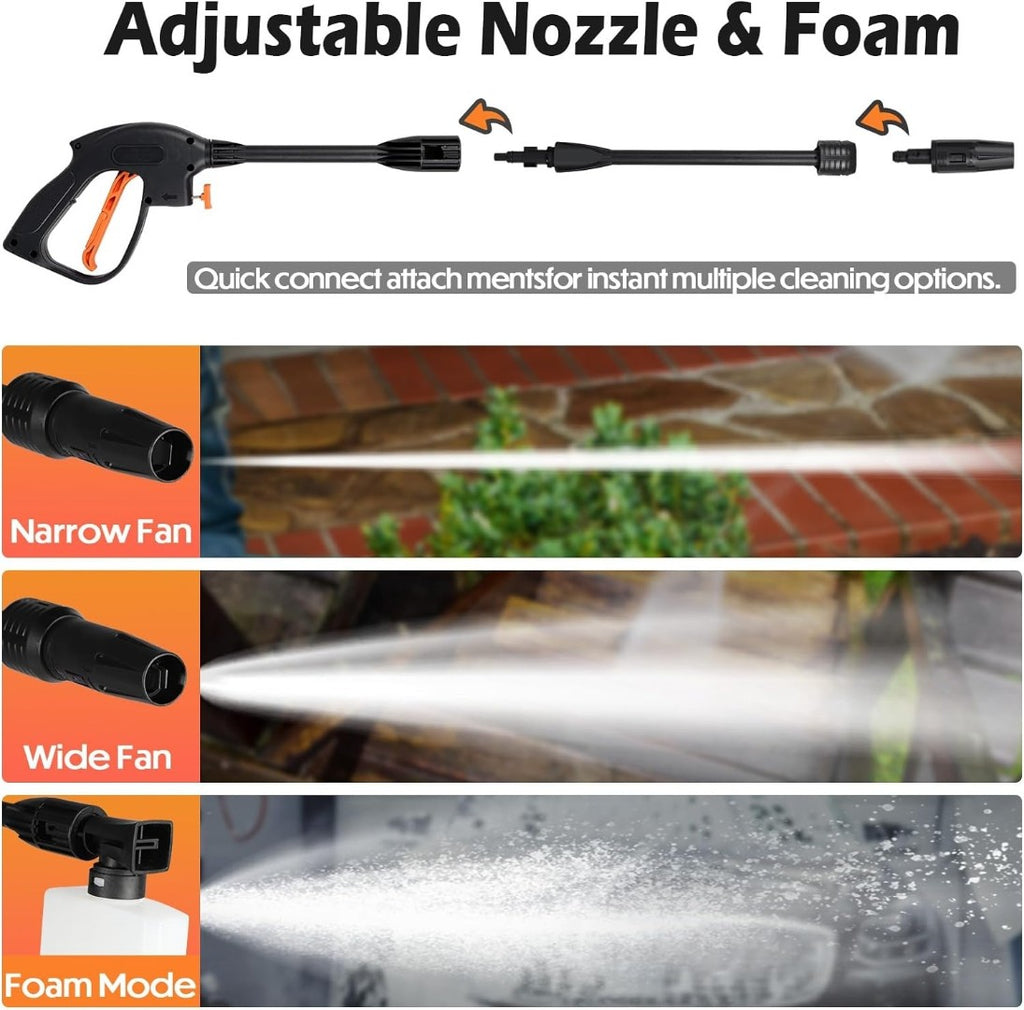 Adjustable Nozzle & Foam Lance --- 2-in-1 nozzle is ideal for all types of cleaning tasks. You can choose a Fan-shaped or a straight line jet by simply turning the nozzle according to your needs. Two cleaning modes increase cleaning surface and efficiency, making it easier to clean corners. The nozzle can be connected to a foam gun soap bottle to help you clean the garden.