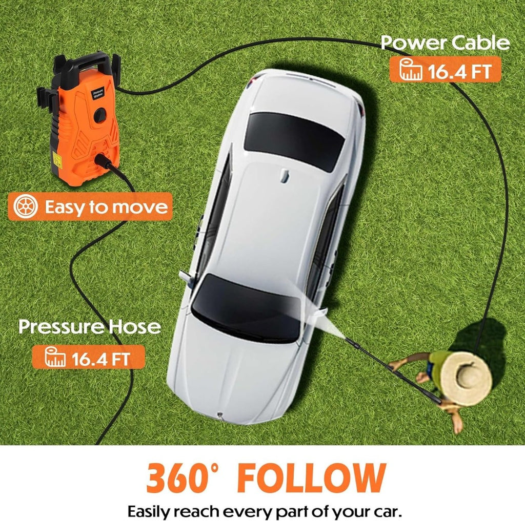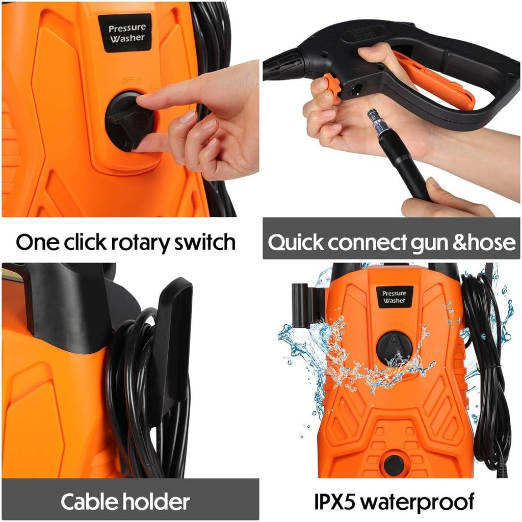 Powerful & Portable ---1300W powerful pressure washer delivers a 100bar working pressure with 410litres/h water flow for fast cleaning, IPX5 waterproofing system, Lightweight portable and wheel design with several hooks easily handle a variety of cleaning task and gives extra storage for all accessories.