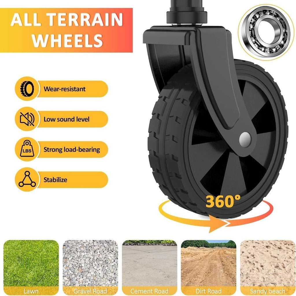 Flexible Wheels: The wheels of the folding garden cart can swivel 360 degrees, ensuring that the wagon cart can move smoothly over a variety of surfaces and can be easily pushed even by children.