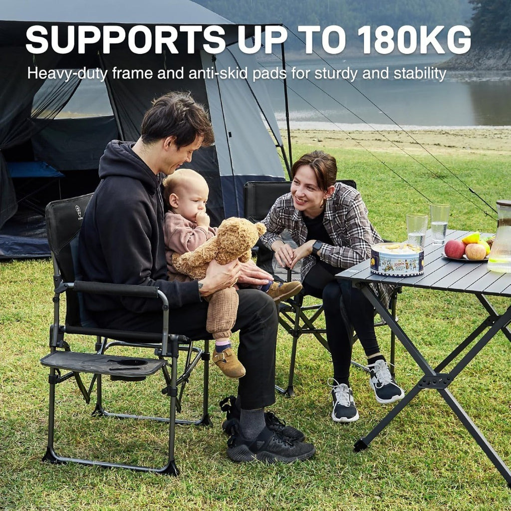 Sturdy and Oversized: This folding directors chair has aluminium iron alloy frame with X-shaped design, which makes it more stable and supports up to 180kg. The seat width of the chair has been widened (53cm), and this camping chair is suitable for heavier people.