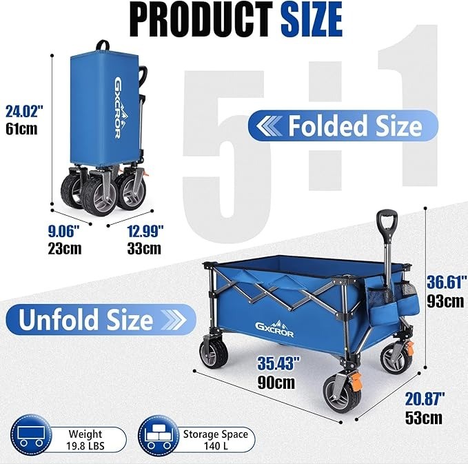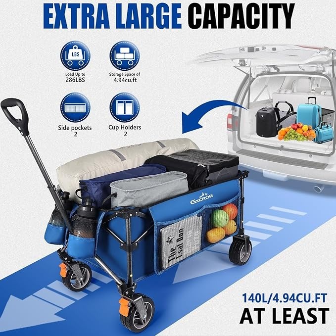 GXCROR Folding Trolley Cart - 140L Heavy Duty Collapsible Wagon with Removable 14.5cm diameter & 6cm Wide Wheels for Camping, Beach, Gardening, 130kg Capacity