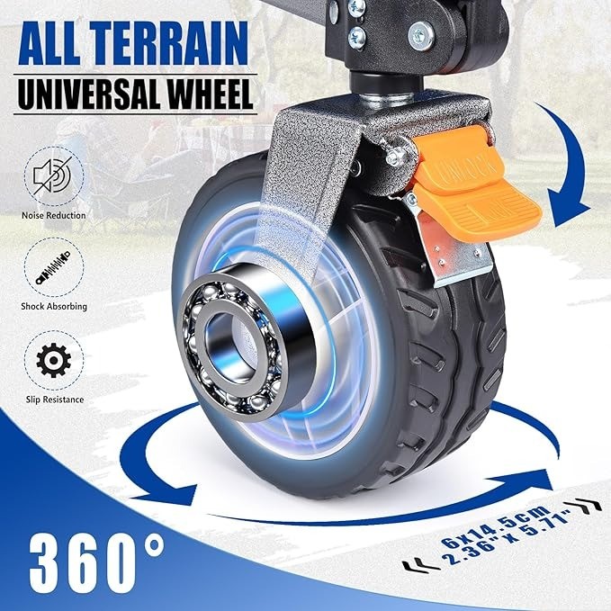 【All-Terrain Oversized Wheels】14.5cm diameter & 6cm wide wheels engineered for sand/grass/rough terrain. Our collapsible trolley cart with beach wagon functionality delivers superior traction, making this festival trolley ideal for sandy shores and concert fields.