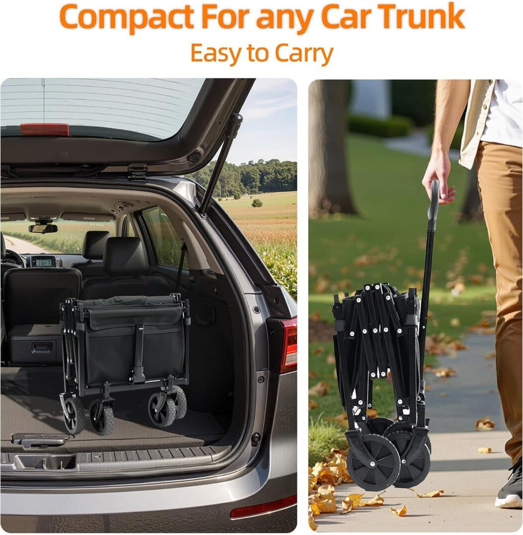 Space-Optimized Storage: Folding system compacts to a small portable size. Effortless car trunk storage with built-in cup holders & organizers, redefining space efficiency for folding wagons.