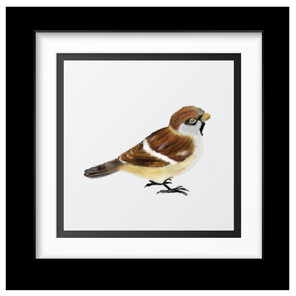 Sammy's sparrow Art Print - This sparrow print illustrated by autistic artist Sammy (SJH Designs) is presented in a square double mount. Frames are extra 2" wooden black frames This image has been painting by Autistic Artist SJH Designs.