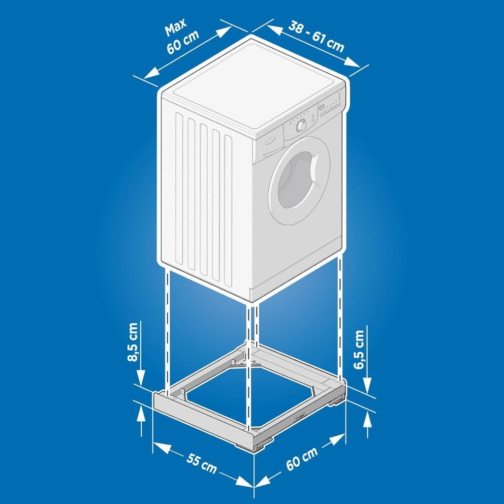 COMPATIBILITY: Universal and compatible with all front loading washing machines and dryers with a width of 60 cm and a depth of up to 61 cm; maximum distance between front and rear feet: 54.5 cm; can also be used with a column of washing machine and dryer; supports up to 250 kg