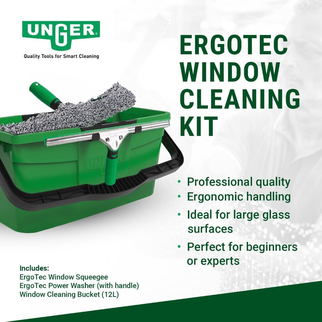 Unger AK013 Window Cleaning Kit – 3-in-1 Starter Set with Window Squeegee, Microfibre Washer with T-Bar Handle & 12L Cleaning Bucket – Professional Window Cleaner Set