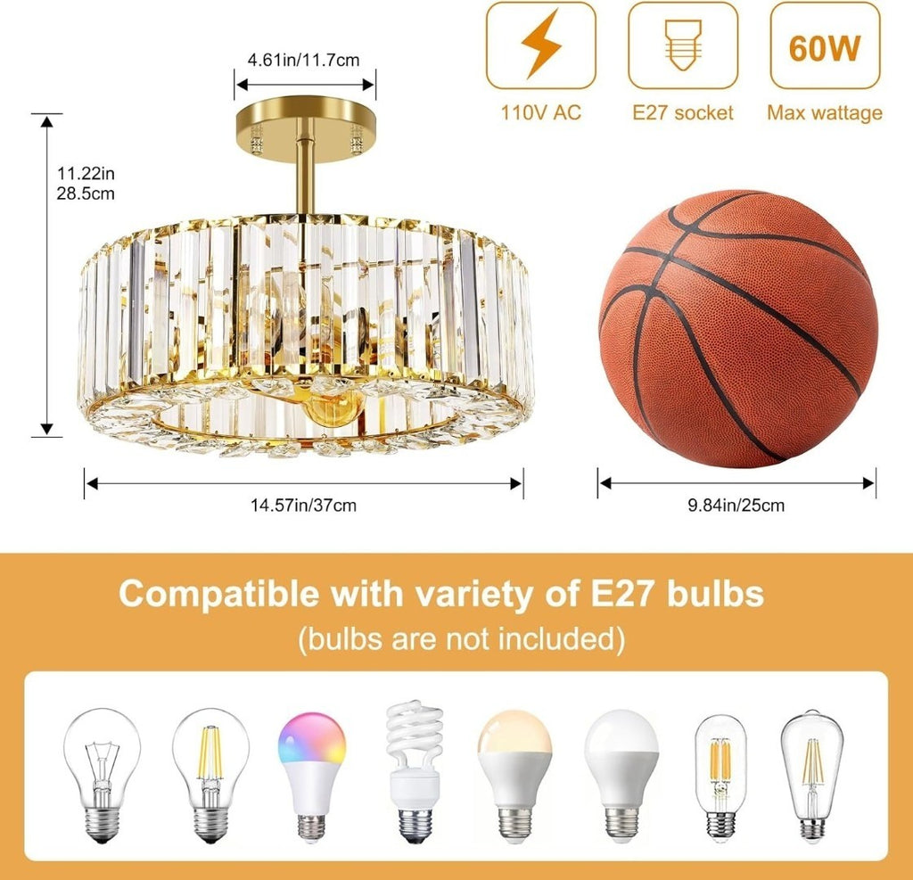 Large Crystal Chandeliers: Ceiling light shade diameter: 14.57"/37cm, base Plate Diameter: 4.6"/11.7cm, Height: 11.22"/18.5cm, this ceiling lamp requires 4 E27 bulbs(maximum 60W per bulb, bulbs not included). This gold ceiling light is also compatible with LED, CFL, Halogen and more.