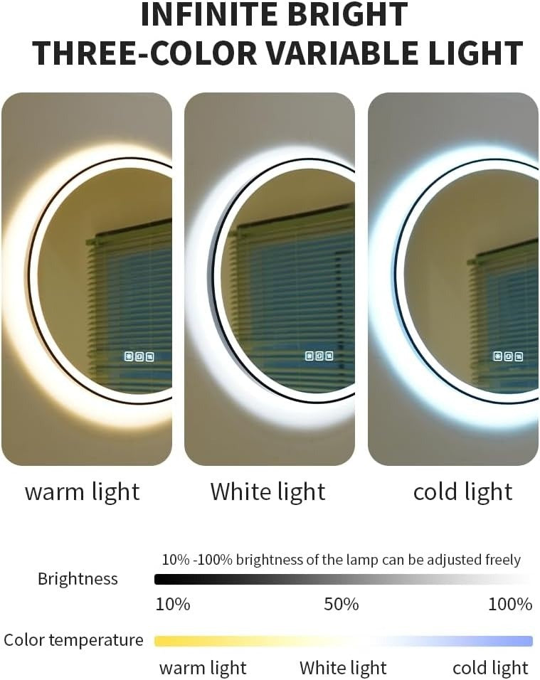 Adjustable light source and 3 colour temperature: Our bathroom mirror with LED lights have (2700k-6000k) colour temperature to choose from, just long press the touch switch to adjust to your favourite brightness.