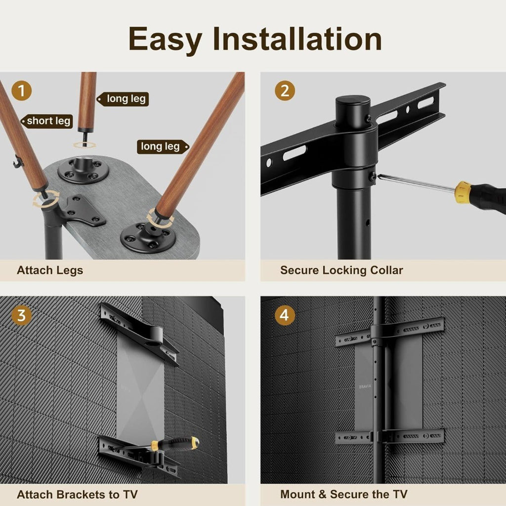 - 【Sturdy Materials with FSC-Certified Wood】This easel TV stand is constructed of high-quality metal and FSC-C ertified wood, supporting up to 77 lbs (35 kg) of TV weight. It has passed rigorous UL/TUV laboratory testing at three times its rated load capacity. For added safety, an anti-tip pull cord is included to help protect your family and children. Despite its solid build, the stand remains easy to move from room to room.
