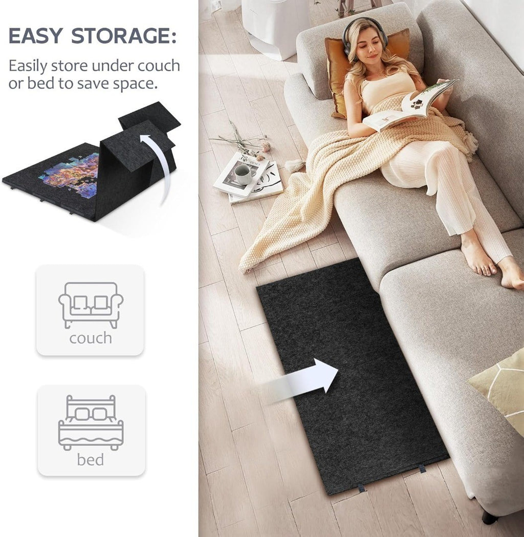 Foldable Jigsaw Board- Can be folded up when not in use and stored under couch or bed to save half storage area. Can be used on any surface like counter, dinning table, coffee table or even floor. The tabletop keep puzzle pieces in place when puzzling with your friends or family completing your favourite puzzle challenges.