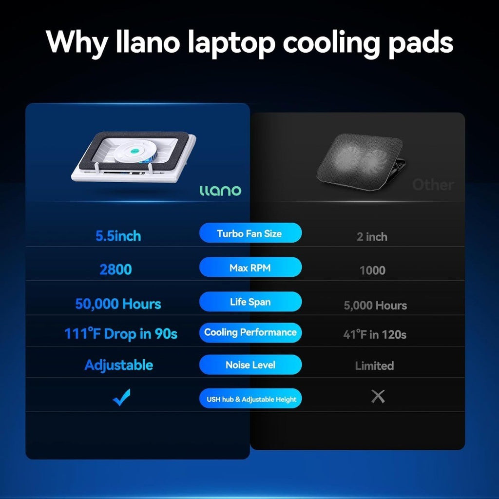 5.5inch Industry-Leading Larger Fan: llano New Upgraded Version laptop cooling pad is equipped with a 5.5inch(14CM) large-diameter turbo booster external fan that guarantees a remarkable 44℃(111℉) temperature drop (CPU+GPU) in just 90 seconds. Whether you're gaming or working on high-intensity tasks, experience uninterrupted, rapid cooling without the hassle of delays or screen flickers