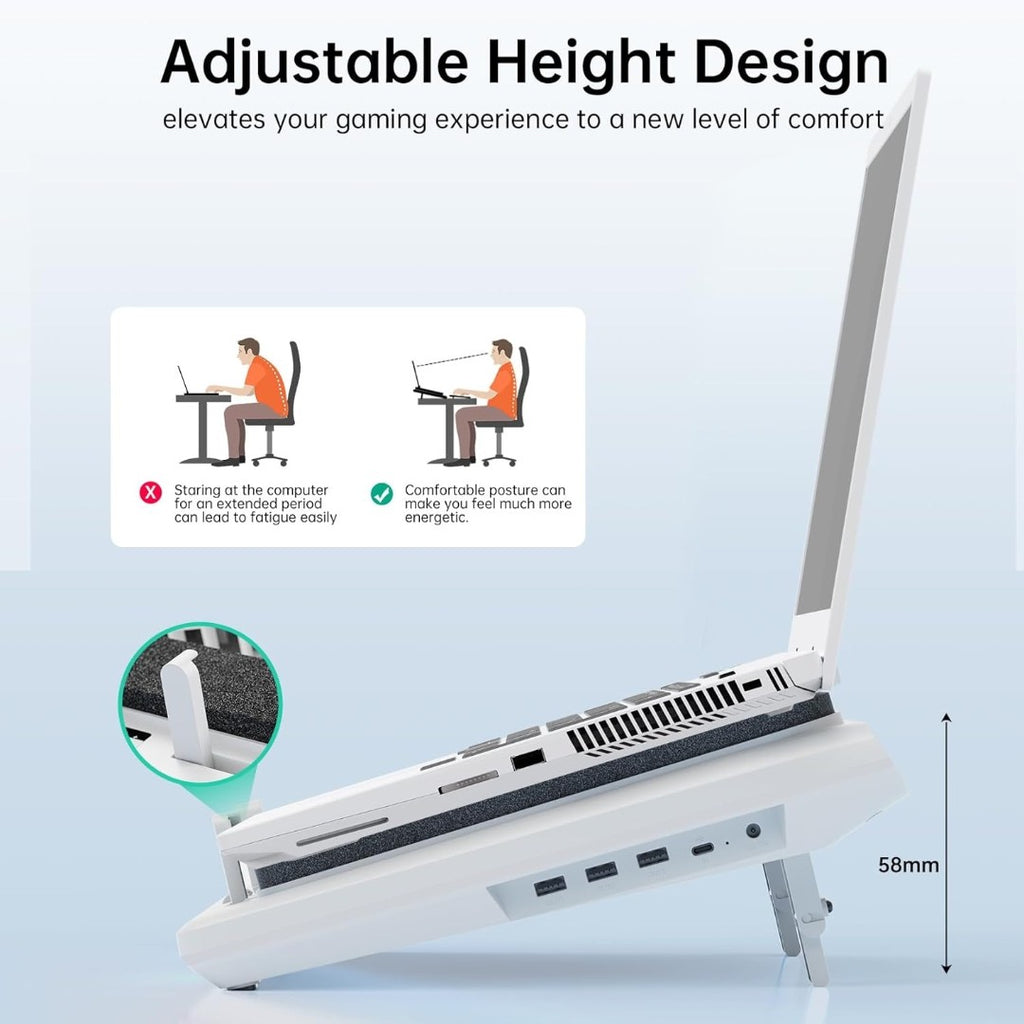 Non-slip baffles & Adjustable height: Enjoy the perfect balance of stability and comfort with our laptop fan stand cooling pad. Featuring double non-slip baffles to securely anchor your laptop on any surface, and an adjustable height function that alleviates neck strain during long usage