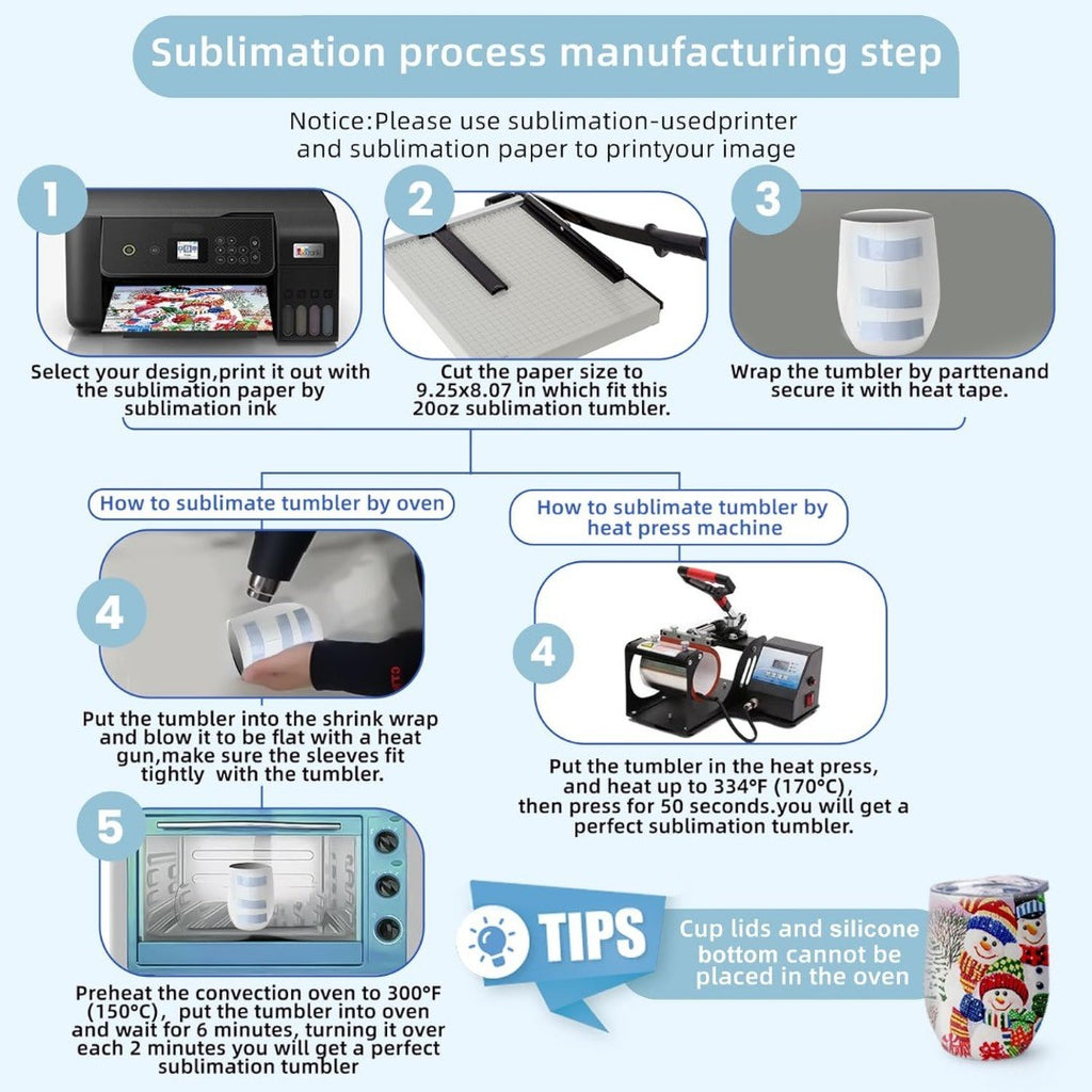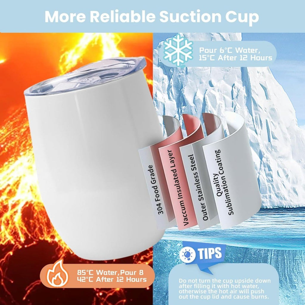 Premium Sublimation Coating: Our tumbler features a top-tier sublimation coating, perfect for achieving vibrant, fog-free prints with a drum-style heat press or a sublimation oven (The cup lid and silicone base pad must not be placed in the oven). For the best results, we recommend using a heat press at 334°F for 50 seconds or an oven at 300°F for 6 minutes.