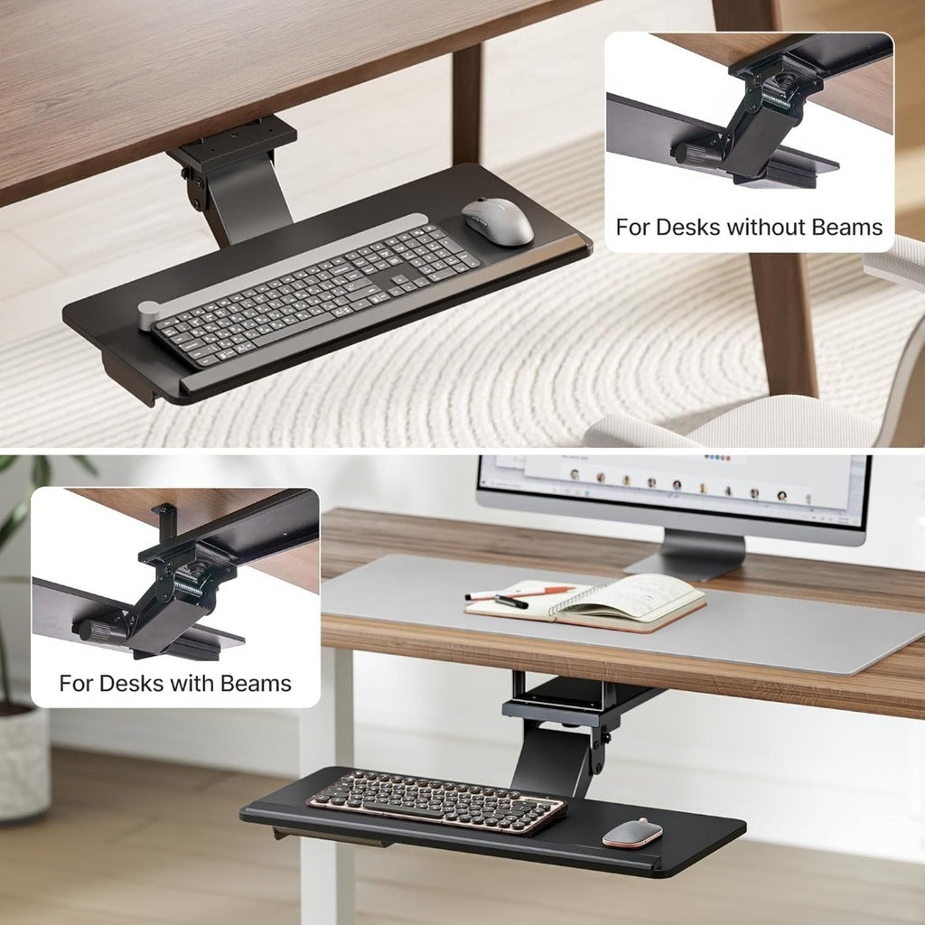 - COMPATIBLE WITH MULTIPLE DESK TYPES: Designed to be compatible with both standard desks and desks with beams, including height-adjustable standing desks. With a quick and simple 3-step installation, this keyboard tray is effortless to set up, making it the perfect addition to any workspace.