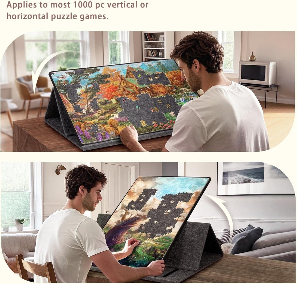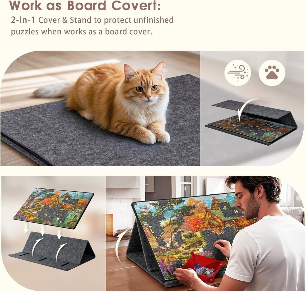 2-In-1 Puzzle Stand & Cover Design -When serving as a stand, the supportive board features a hook and loop design that allows you to set up the puzzle board at your favorite angle with absolute stability. When serving as a protective cover, the board guards your unfinished game against dust and prevents it from being messed with by naughty pets.