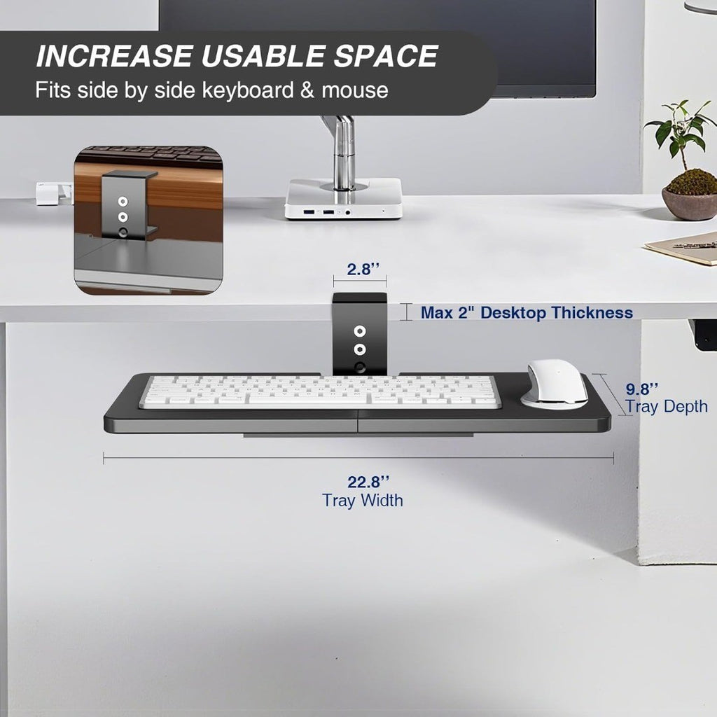 360 Degree Rotation Adjustment: This 23” x 10” keyboard tray to your desk with a rotating clamp, It provides a generous surface and this keyboard tray pivot a full 360 degrees (32" clearance needed for circumference). Please kindly confirm the product size is what you need before purchasing.