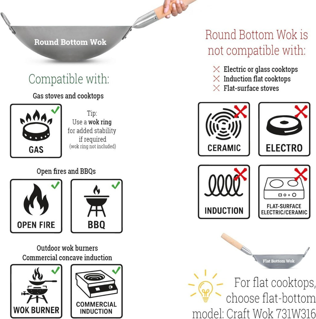 Not suitable for flat electric or flat induction stove. Carbon steel wok may rust. Do not forget to season it before use! Instructions for easy seasoning are included with the wok. Our customer service is ready to guide through the process whenever you need it.
