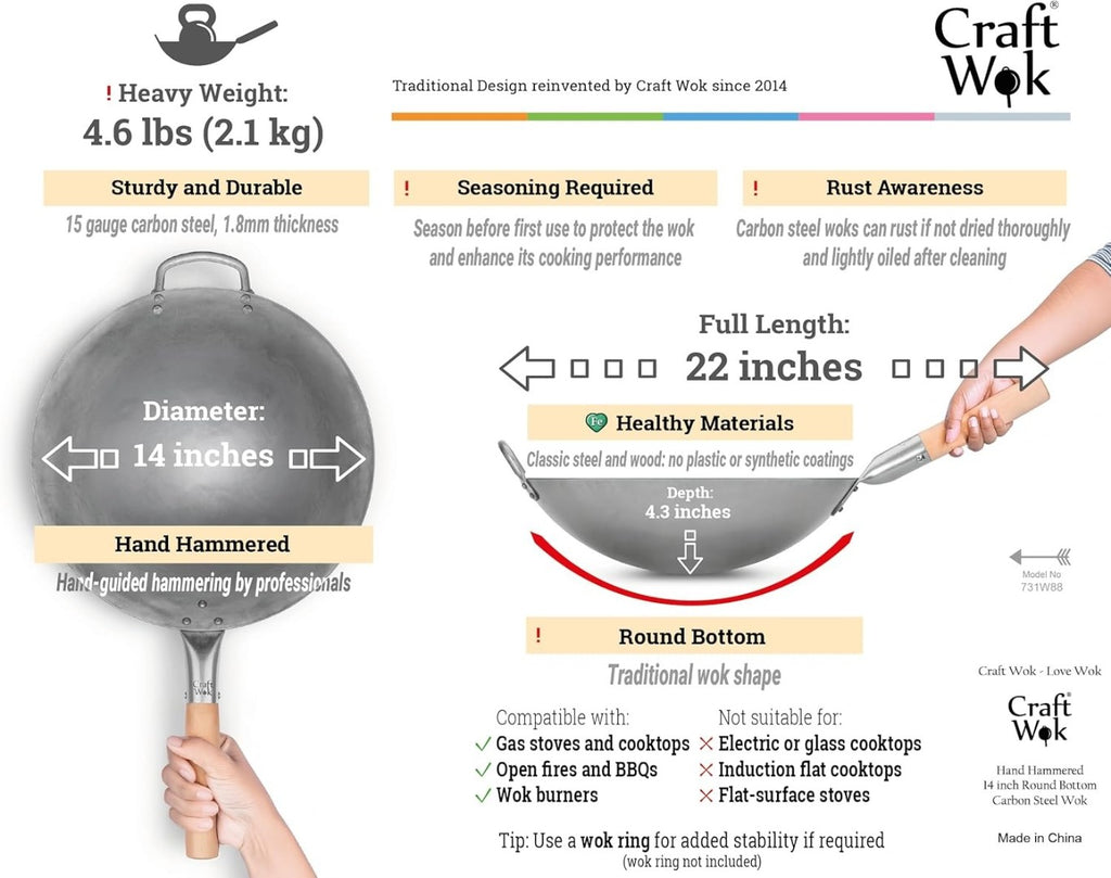 Round Bottom Heavy 14 Inch 1.8mm carbon steel wok, commercial grade. Original design by Craft Wok since 2014, proven quality over the years. Traditional Chinese wok pan with round bottom.