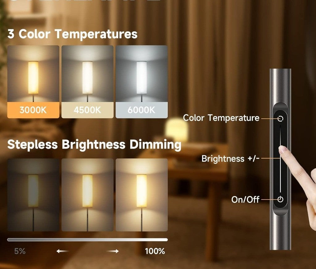 This modern LED floor lamp offers adjustable brightness levels, allowing you to create the perfect lighting for reading, relaxing, or general room illumination. The included remote control makes it easy to switch modes, dim the light, or adjust settings from anywhere in the room. With its slim, contemporary design and Energy Class A efficiency, it fits seamlessly into a wide range of interiors. Ideal for living rooms, bedrooms, home offices, apartments, or anyone wanting a stylish, energy‑efficient lighting solution.