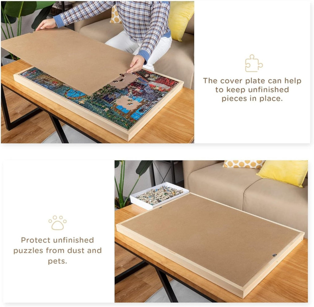 Wooden Cover - A puzzle board cover is included to protect your unfinished games from dust and naughty pets. Puzzle board size: 79 54 4 cm; Cover size: 76 51 cm. Suitable for most 1000pc jigsaw puzzles.