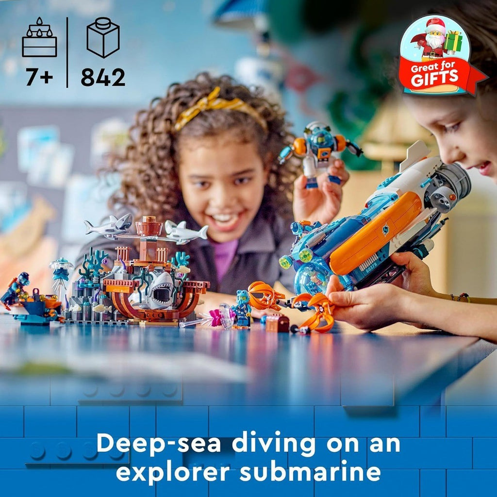 LEGO City Deep-Sea Explorer Submarine Toy, Underwater Ocean Set with Drone, Sharks, Shipwreck and Diver Minifigures, 842 Pieces, for Age 7+ 60379