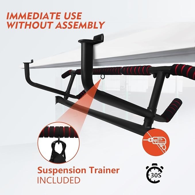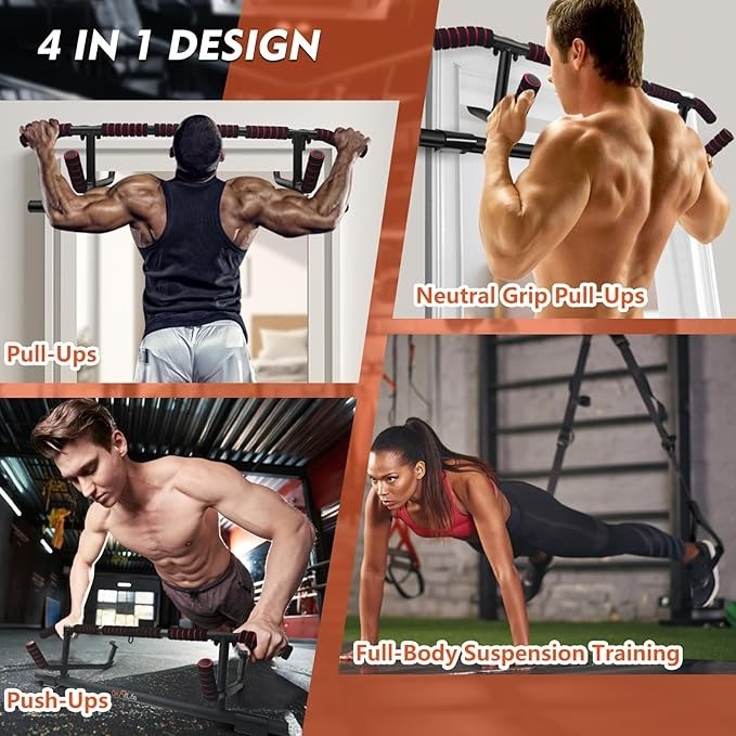 4-IN-1 MULTIFUNCTIONAL TRAINING: This versatile pull-up bar allows a wide range of exercises, including pull-ups with different grips (wide, narrow, parallel, and chin-up), leg raises, pull-ups with additional weight, and more. The included suspension trainers enable effective full-body workouts at home.