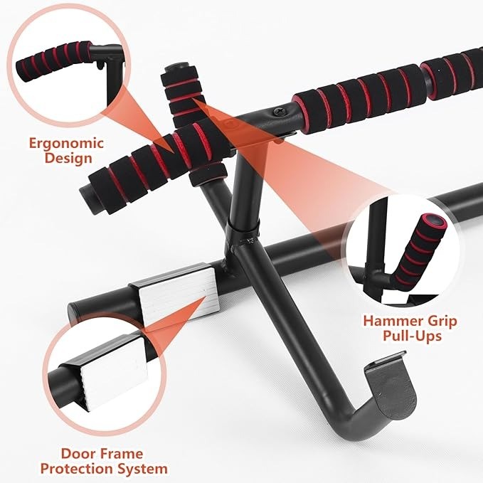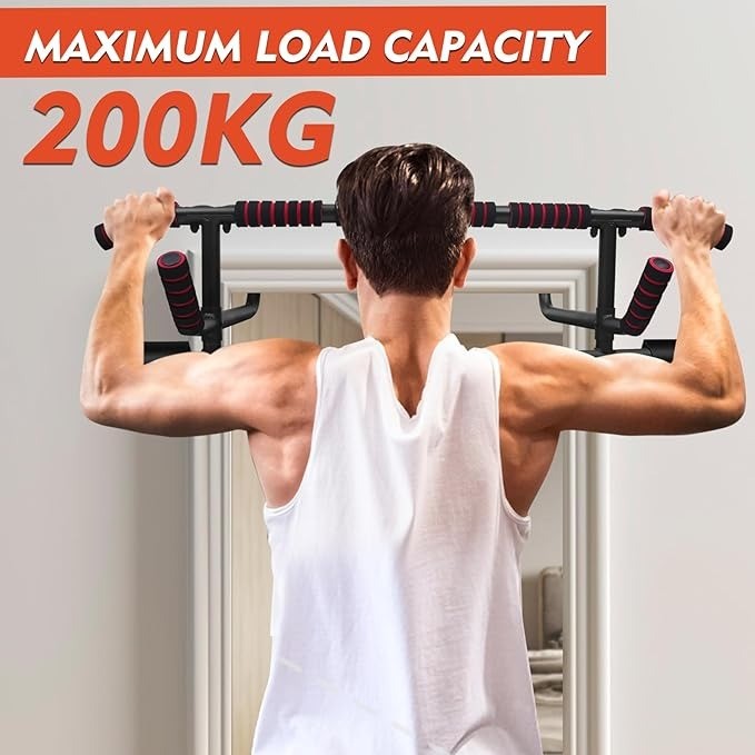 RELIABLE PROTECTION FOR YOU AND YOUR HOME: Made from high-quality materials and supporting up to 200 kg, this door pull-up bar offers maximum stability during every workout. Dual protection is provided by the secure door hooks and rubber caps, keeping the bar firmly in place while protecting your door frame and walls from scratches or marks.