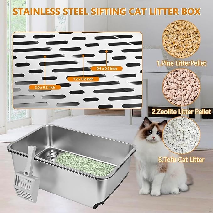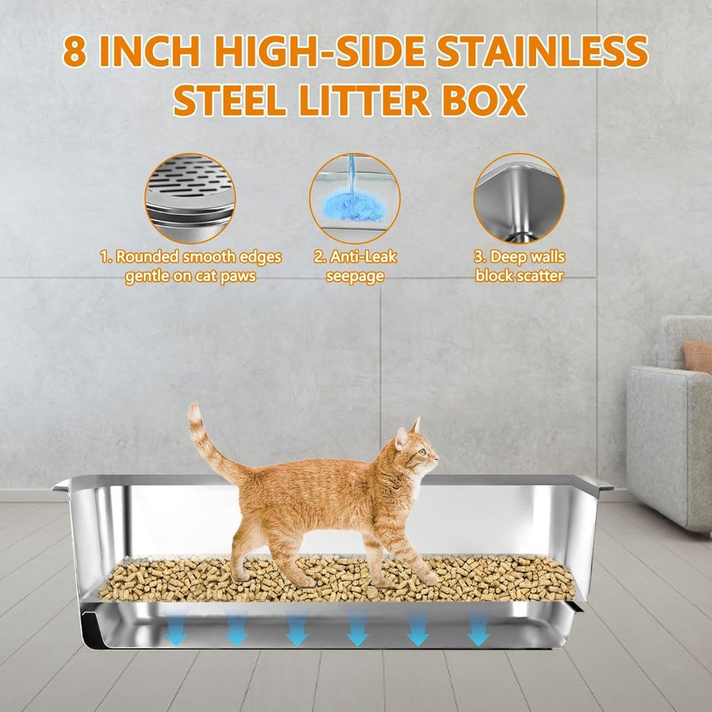 - Sturdy Stainless Steel for Long-Term Use: Sturdy stainless steel litter box–resists scratching for long-term use. Perfect for pine pellet cat litter or clumping litter. Sturdy enough for big cats and multi-cat households