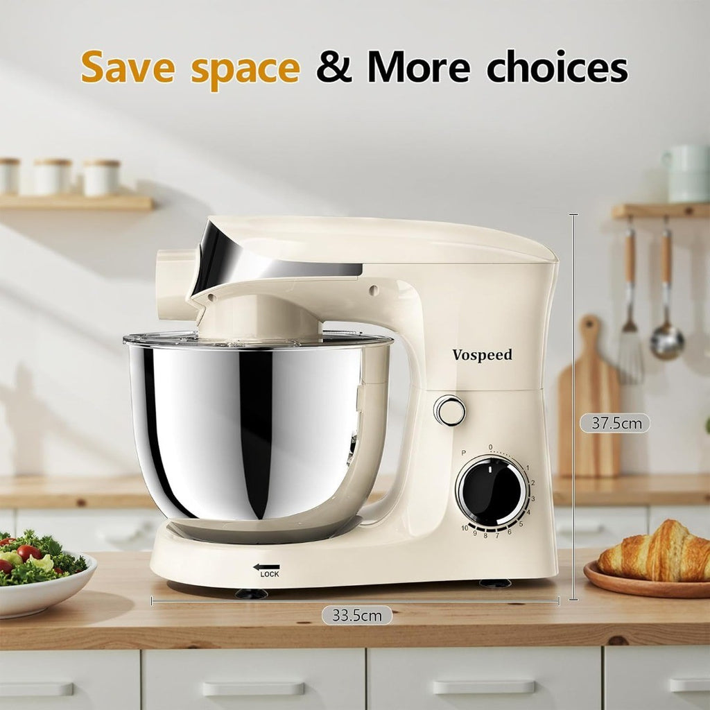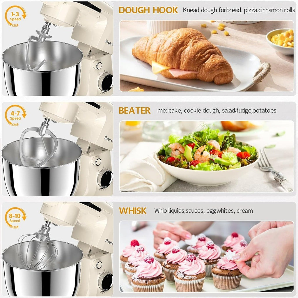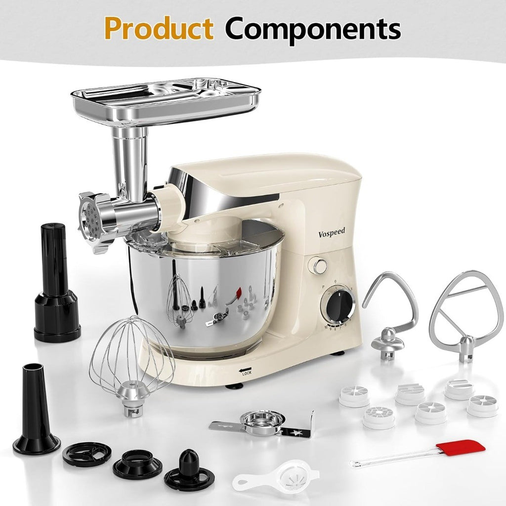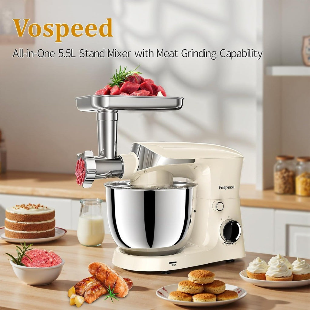 Vospeed Stand Mixer, 5.5L Food Mixers for Baking, 1500W Tilt-Head Electric Kitchen Mixer, Cake Mixers with Dough Hook, Whisk & Beater,Meat Grinder Attachment...(White)