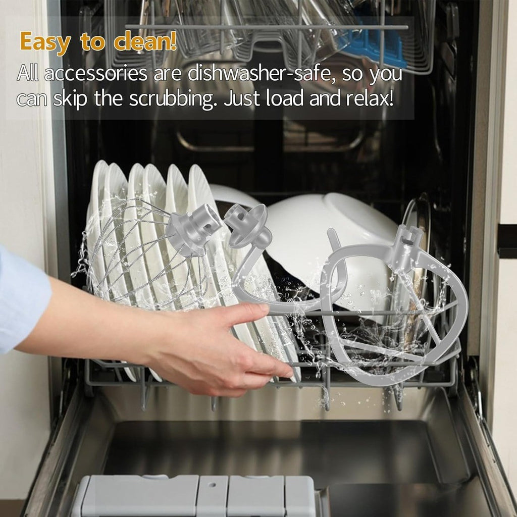 Food-Grade Materials & Dishwasher-Safe: The electric kitchen mixers including attachments, meat grinder components, are crafted from stainless steel and BPA-free materials, ensuring safety during food preparation. All accessories are easy to install, more durable, and dishwasher safe for easy cleaning.