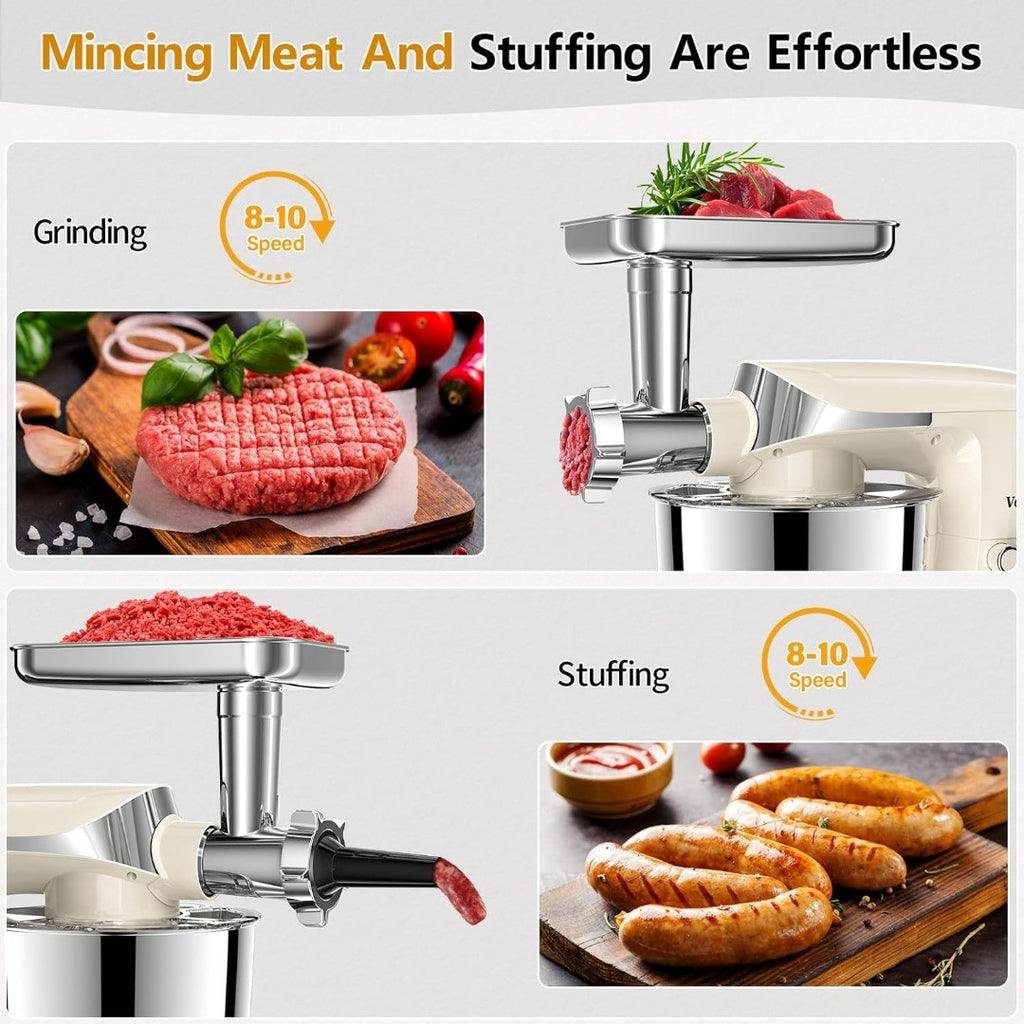 Upgraded Multifunctional Design: Mixers for baking not only includes 3 versatile attachments, but also provide meat grinder-Dough hook (ideal for bread and pizza doughs), Beater (great for batters, mashed vegetables, and jams), Whisk (perfect for whipping cream and egg whites). Meat grinder attachment (with sausage stuffing function) for creating homemade burgers, sausages, and more.
