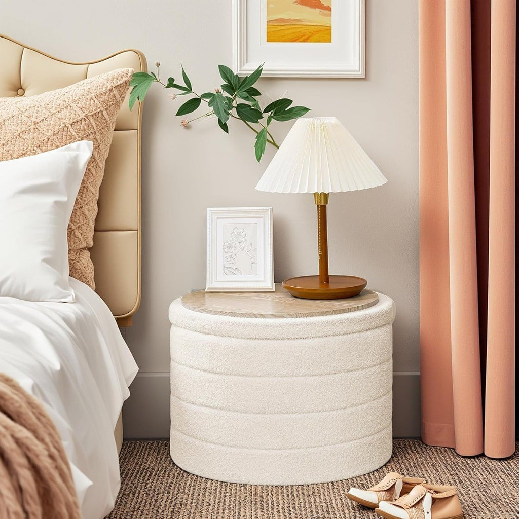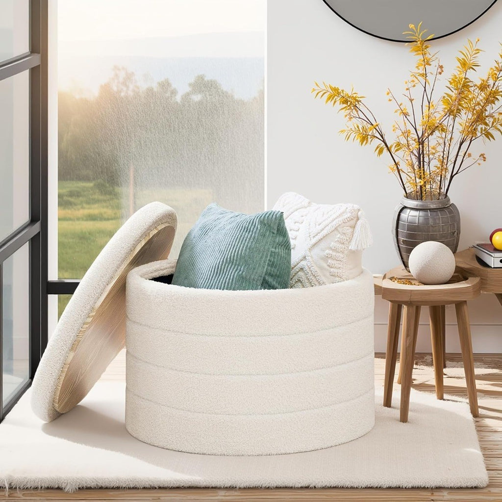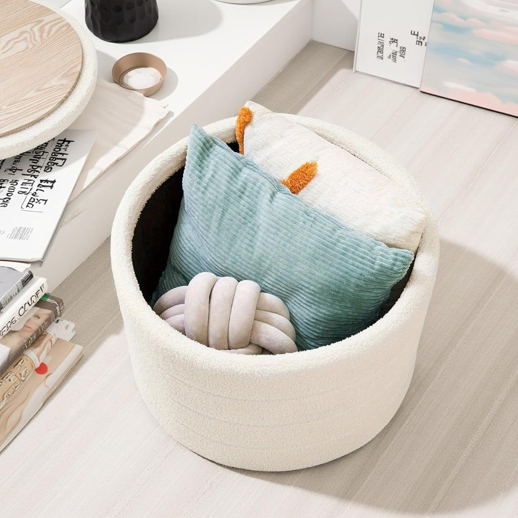 Decorative Design - A dreamy design with round shaped ottoman storage with lid, elegant and eye-catching, Foldable structure design, assembled in seconds, no tool needed, easy to carry or store when not in use.