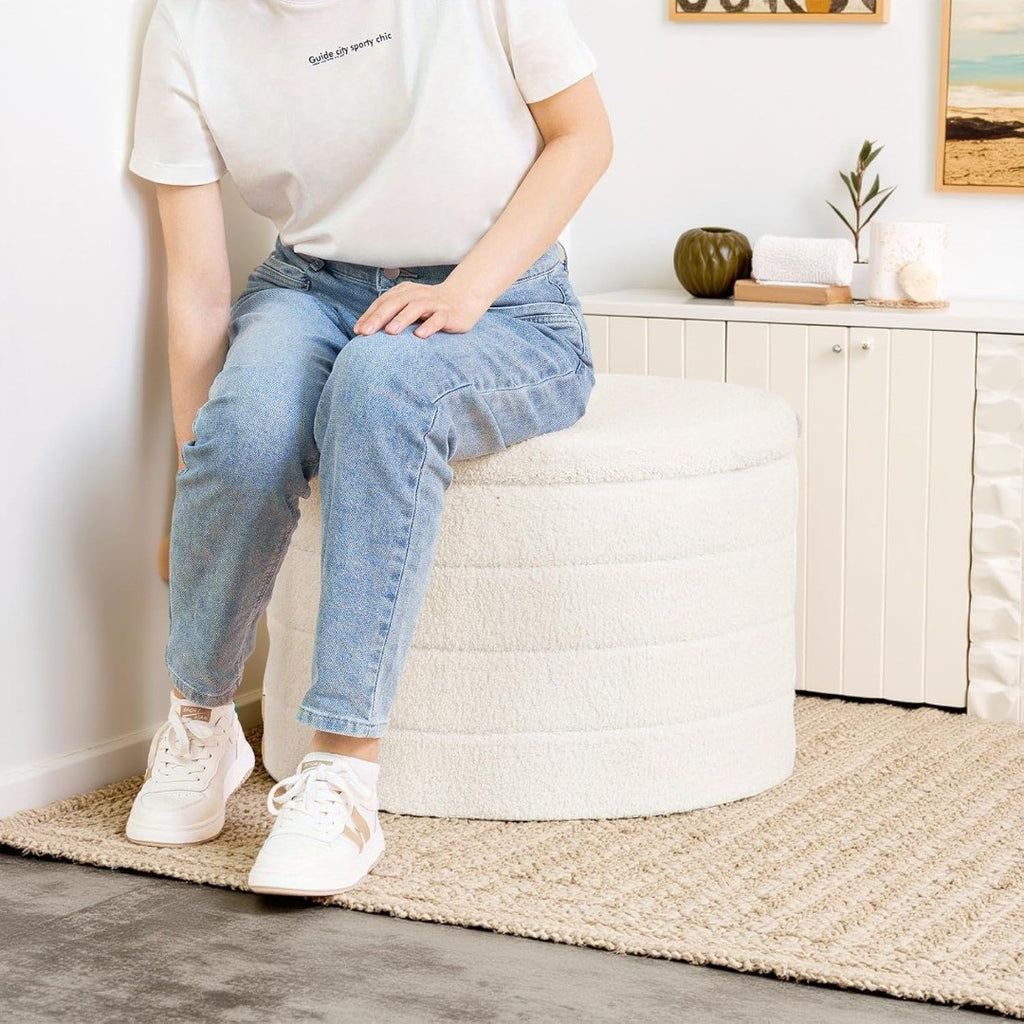 Many Uses - This is round shaped ottoman ideal for the living room or bedroom as an extra seat, impromptu coffee table, kid’s toy chest, vanity stool, or for soothing tired feet as footstool.
