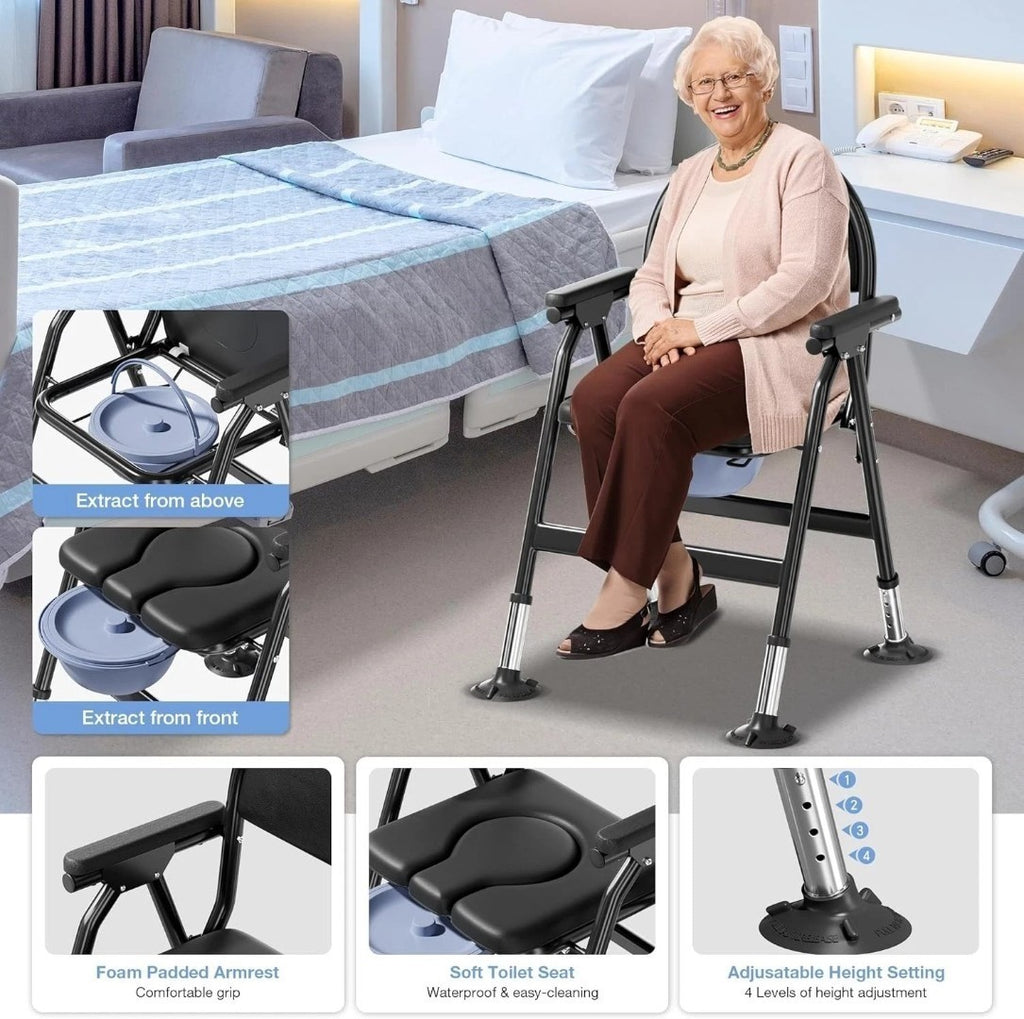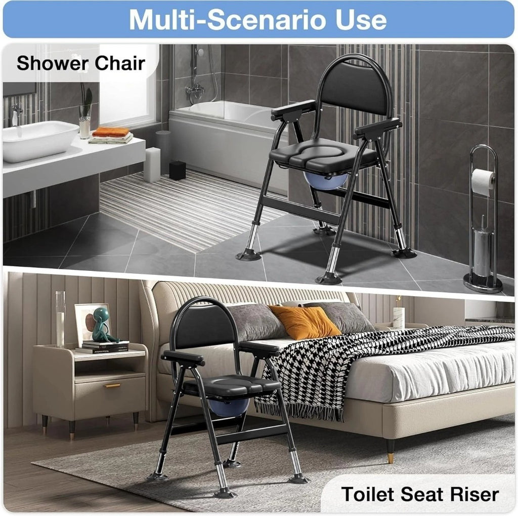 - 3-in-1 Versatile Design-Multi-functional convenience: Use as a bedside commode, shower seat, or portable toilet. Includes a quick-release bedpan (slide-out or lift-up design) for hassle-free cleaning.