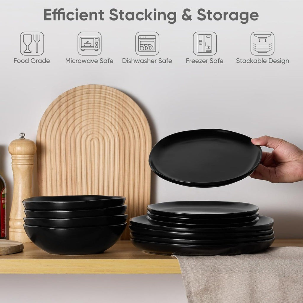 Healthy Dining: These 12pcs dinnerware set are made of food-grade stoneware and premium hard glaze, Specifically designed to be non-toxic and user friendly, No harmful substances will flake or chip off, The plates and bowls are right size and deep that you can easily cope with sauces not overflowing on your table, make eating food a real pleasure.