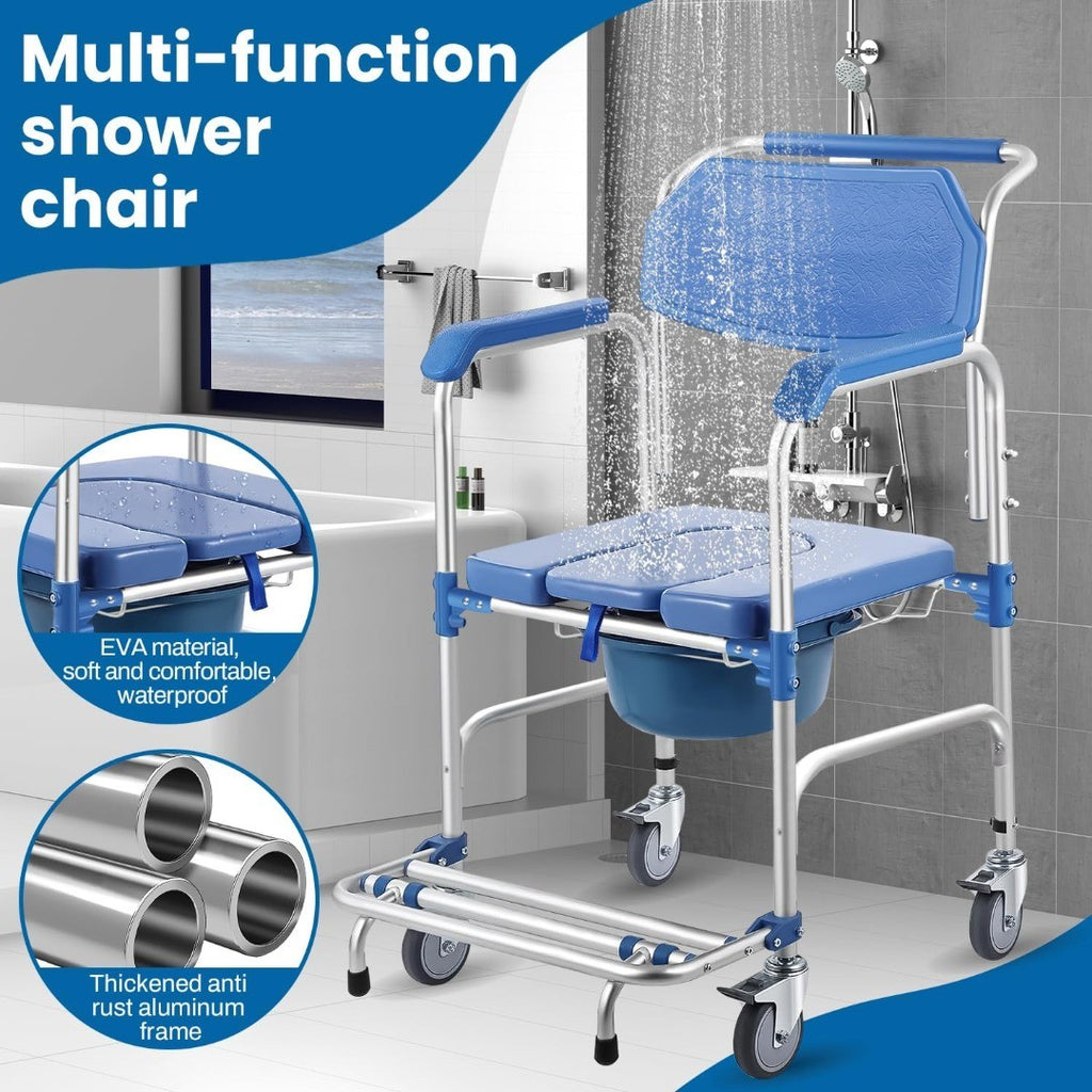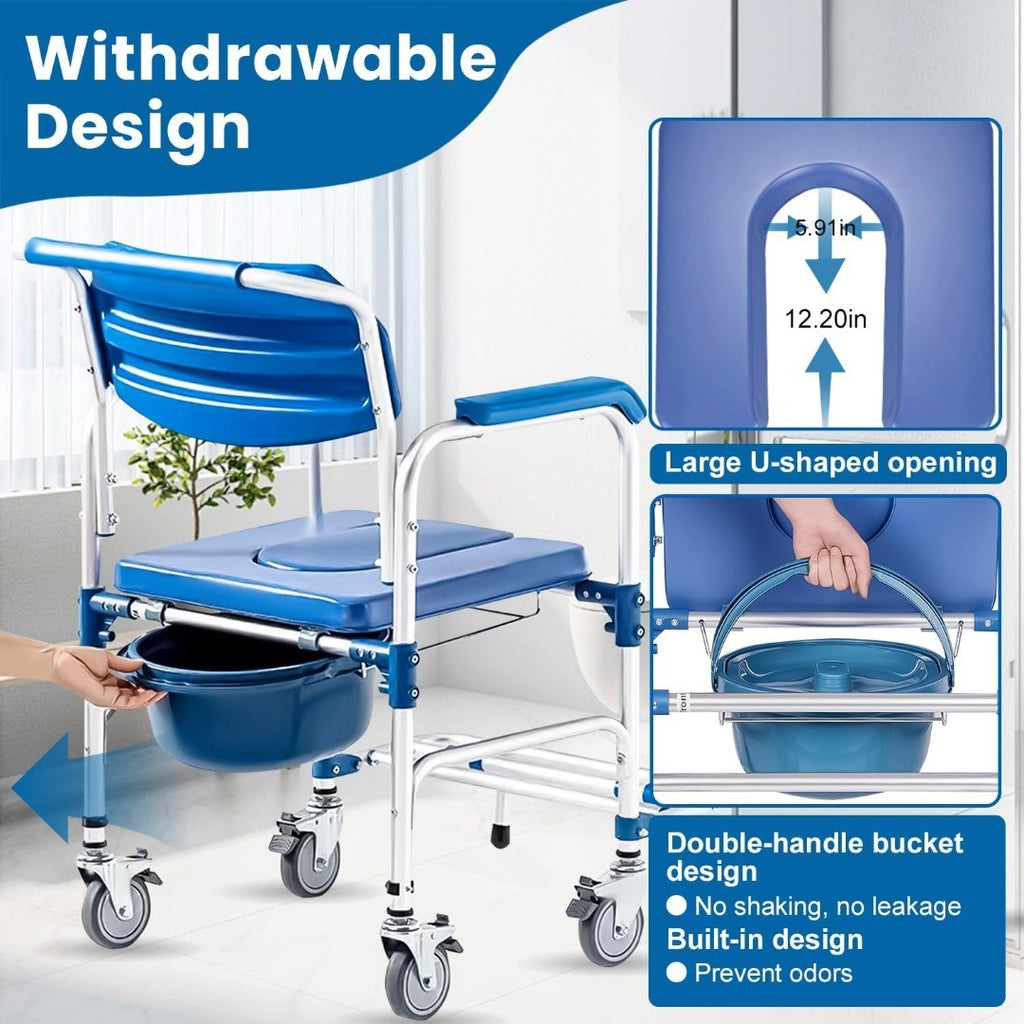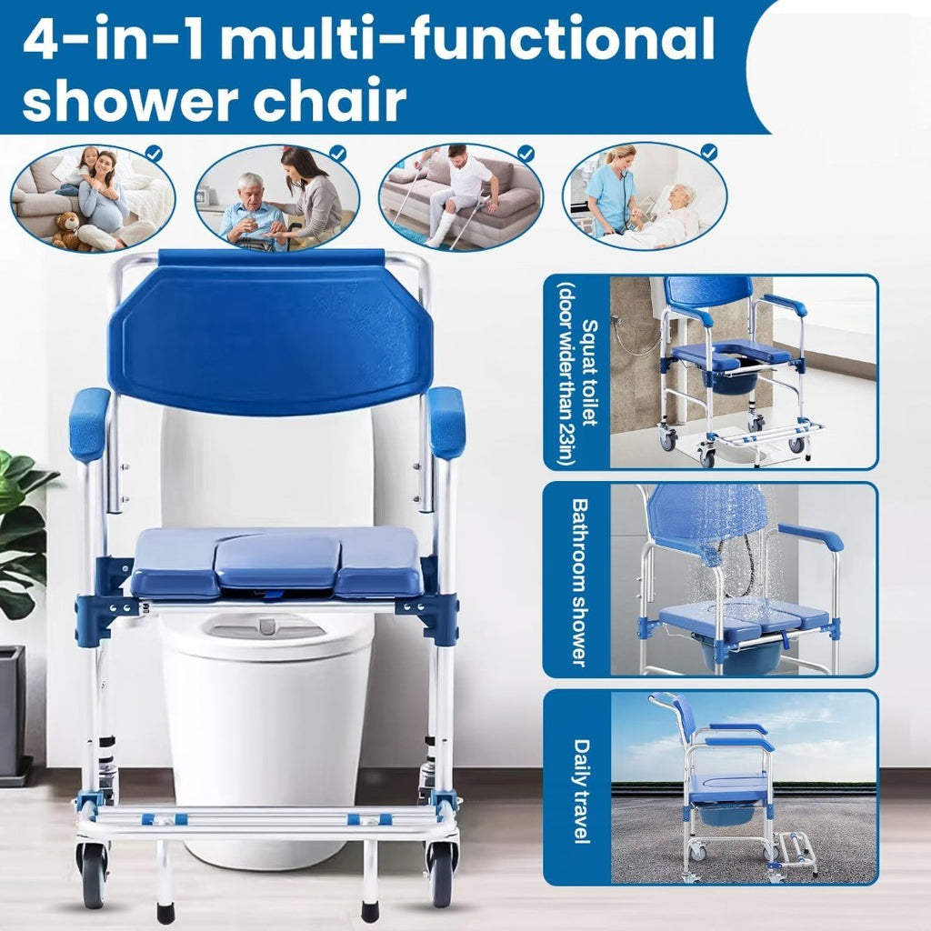 【4-in-1 Multifunctional Design】This wheeled commode chair seamlessly combines a shower chair bedside commode portable toilet and mobility aid into one versatile unit providing essential support for the elderly disabled or post-operative users in bathroom bedroom or hospital settings