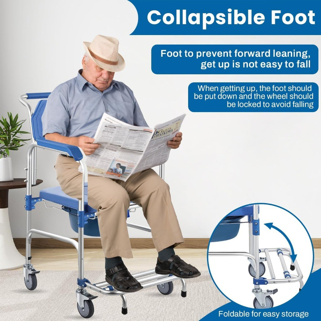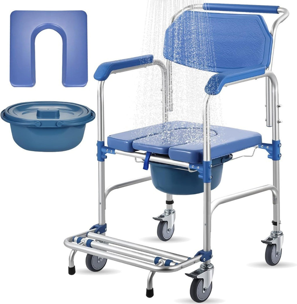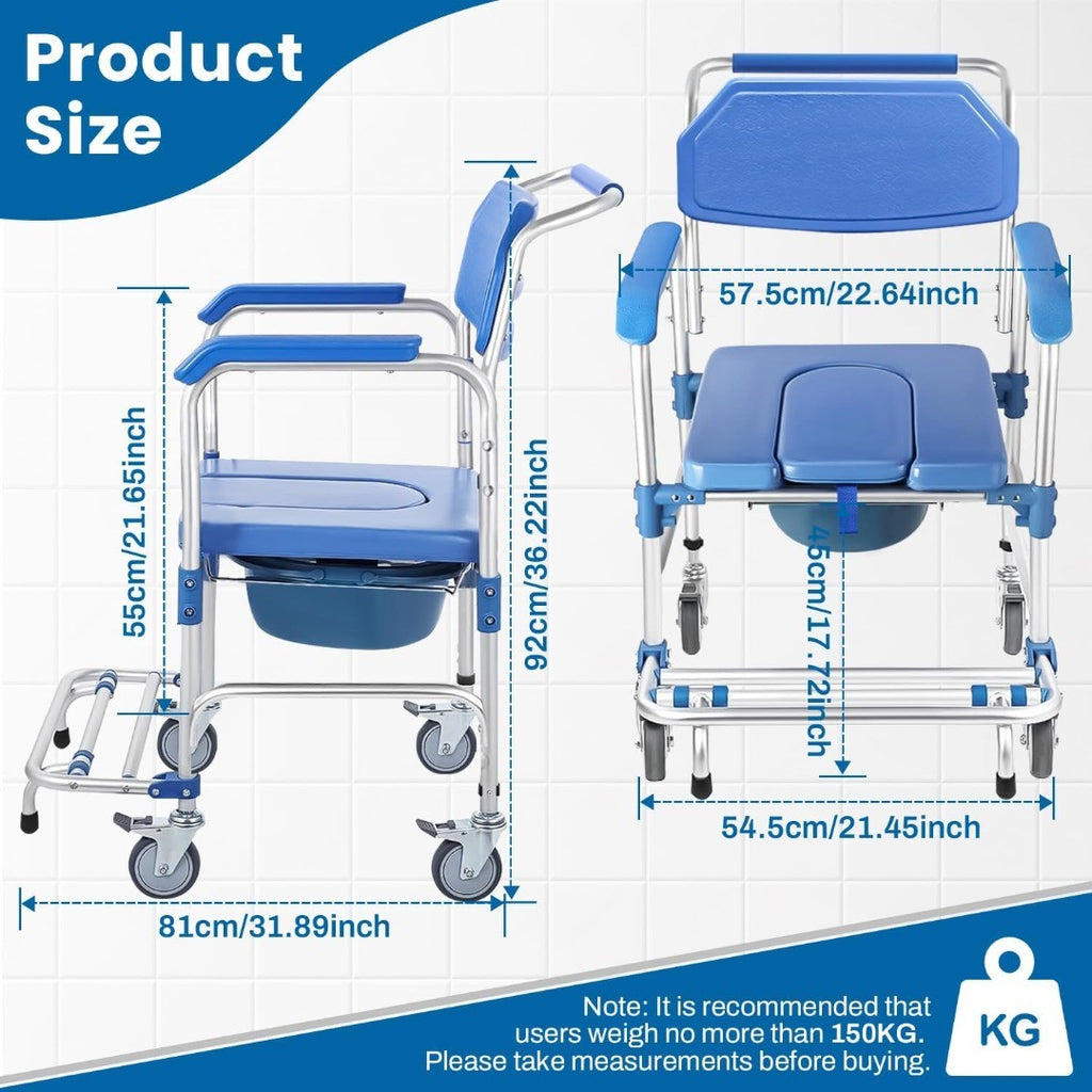 【4-in-1 Multifunctional Design】This wheeled commode chair seamlessly combines a shower chair bedside commode portable toilet and mobility aid into one versatile unit providing essential support for the elderly disabled or post-operative users in bathroom bedroom or hospital settings