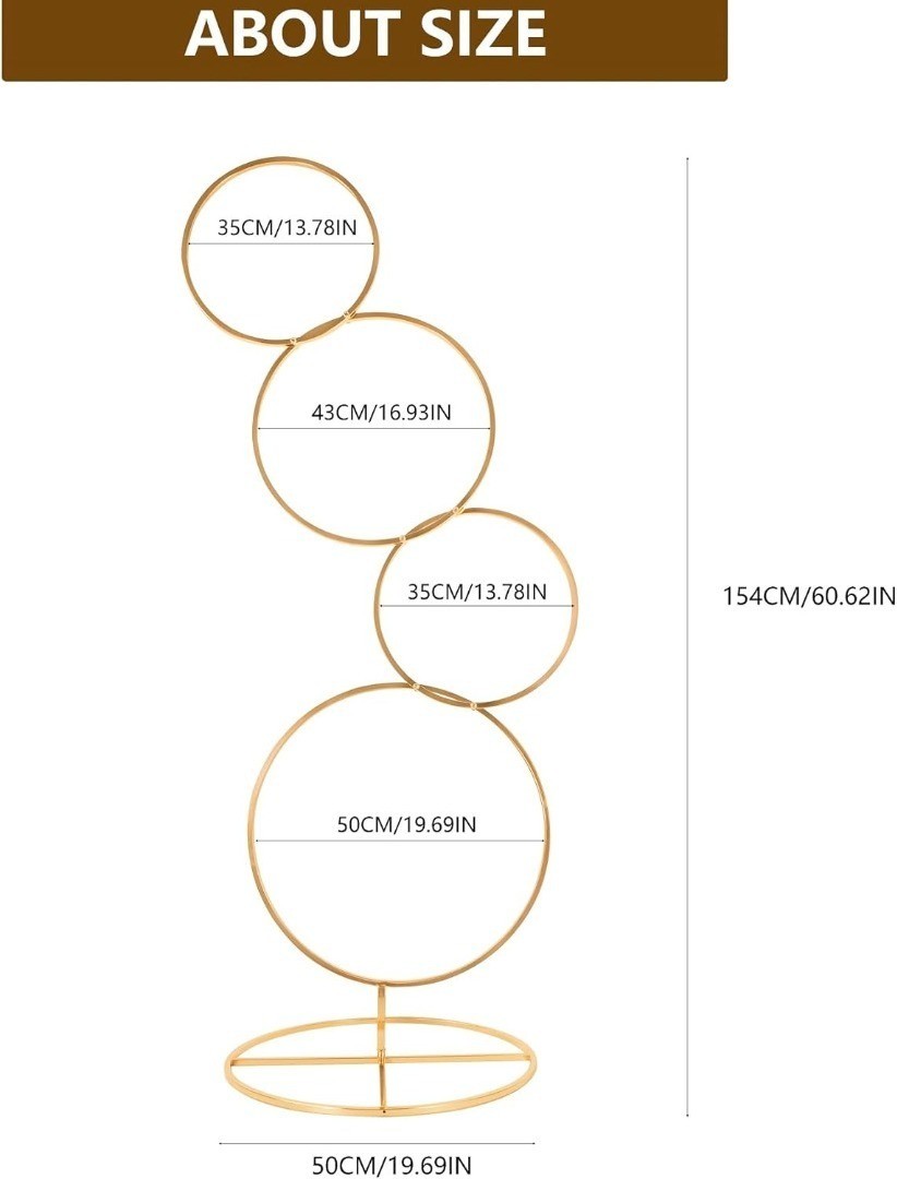 Package Include: 2 Pcs gold arch backdrop stand, 1x Base (19.68in/50cm x 3.93in/10cm) 1x Large Hoop(19.68in/50cm) 1x Medium(16.92in/43cm) Hoop 2x Small Hoops (13.8in/35cm), and the overall size is 60"H x 33"L (Fake flowers for decoration in the pictures are not included.)