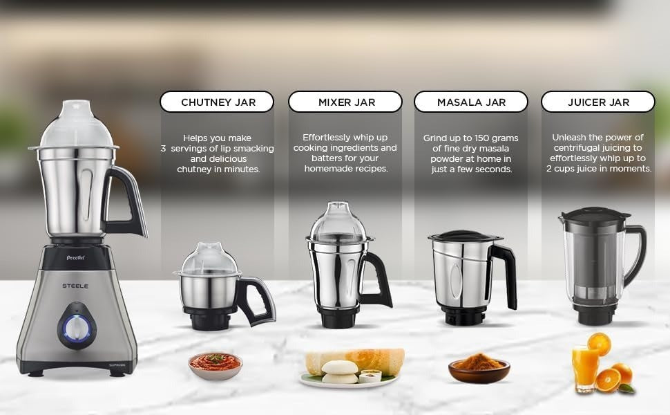 - 4 Stainless Steel Jars: Multipurpose use for grinding, blending, juicing, and chutneys.