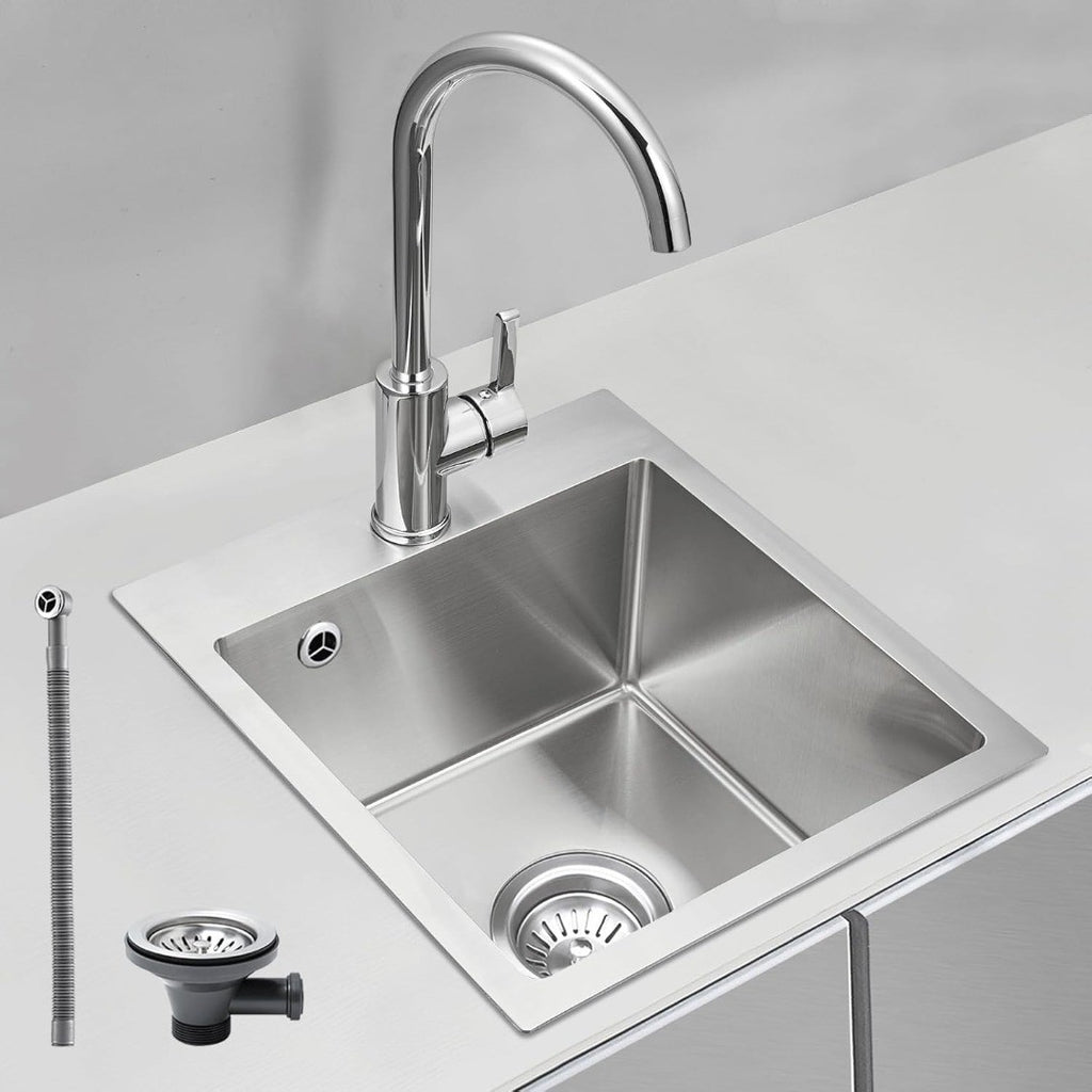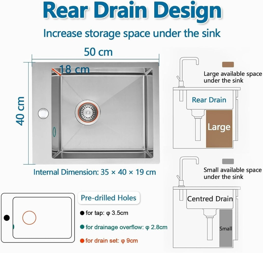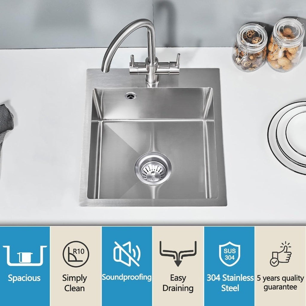 ROVOGO 50 x 40 cm Stainless Steel 304 Kitchen Sink with Basket Strainer Waste and Overflow Kit, Small Kitchen Sink with 3.5 cm Tap Hole, Brushed Single Bowl Kitchen Sink