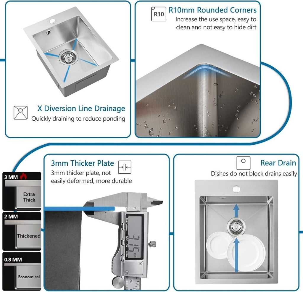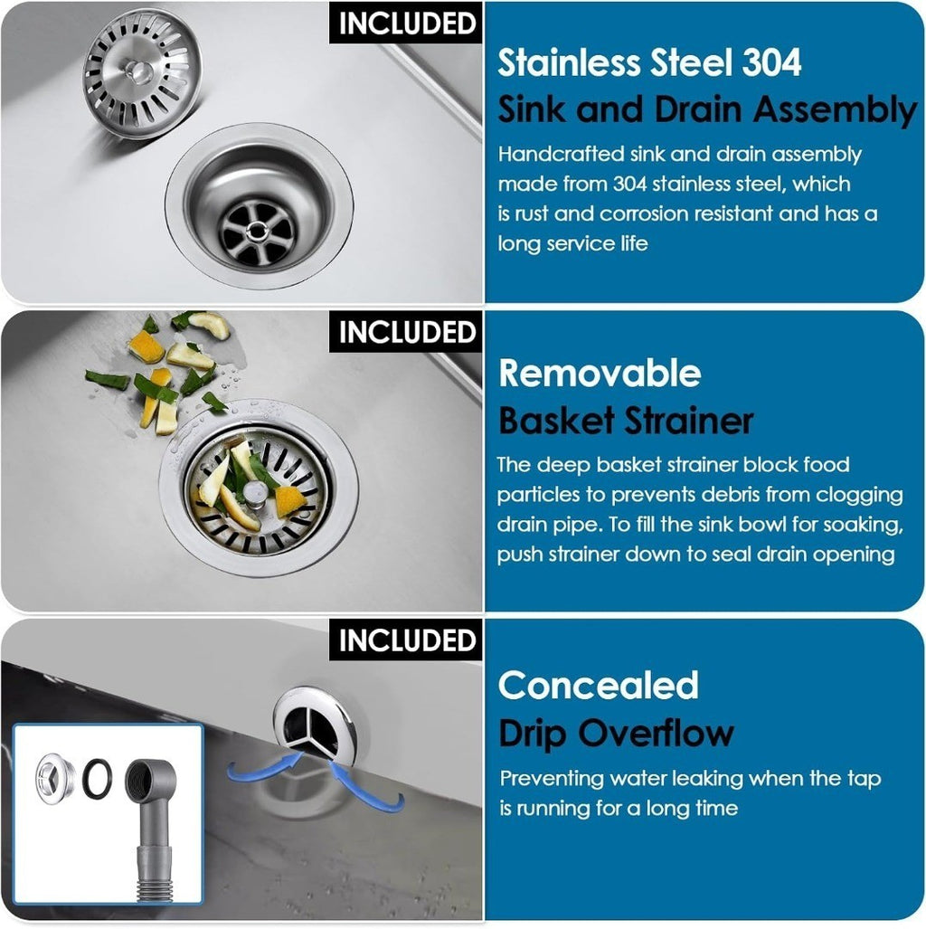 Premium 304 Stainless Steel: Made of high quality 304 stainless steel, it is resistant to impact, corrosion, wear and tear, and has a longer lasting performance compared to other material sinks.