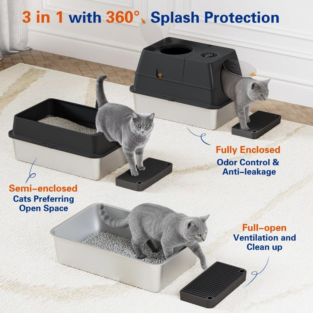 Detachable Modules & Dual Entry Mode: Designed with an easy-to-assemble modular system, this litter box supports both fully enclosed and semi-enclosed configurations to meet your pet's needs. Cats can enter through the front door and exit from the top lid, or use the top lid for both entry and exit. This dual-entry design helps prevent litter tracking and reduces mess, making it a convenient choice for pet owners.