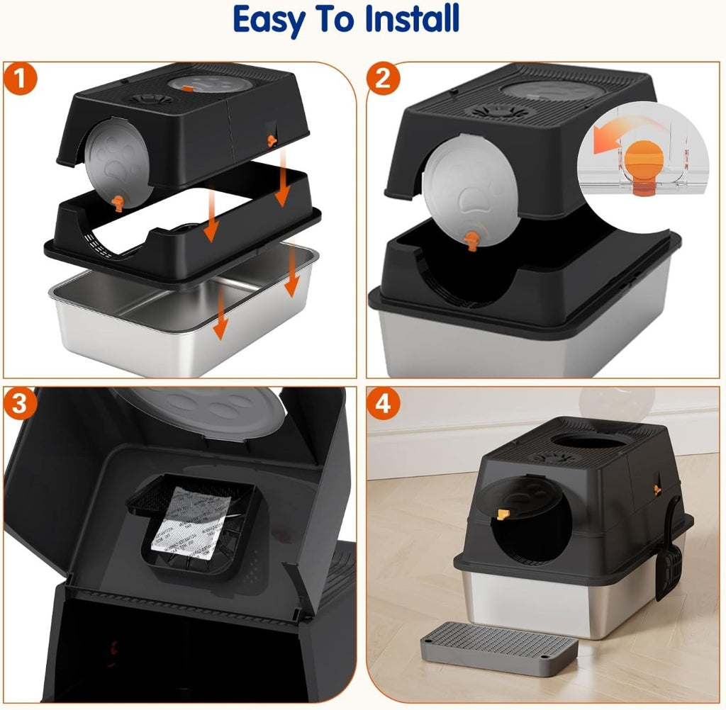 Easy to Clean: The 120-degree flip-top design makes the daily cleaning of the cat litter box even easier and more convenient. You can easily open the door of the cat litter box and clean it with a cat litter scoop without having to remove the entire lid. Thanks to the high-quality stainless steel material, if you need to wash it, simply rinse it with water and wipe it gently. Unlike plastic cat litter boxes, no foreign objects will stick to it.
