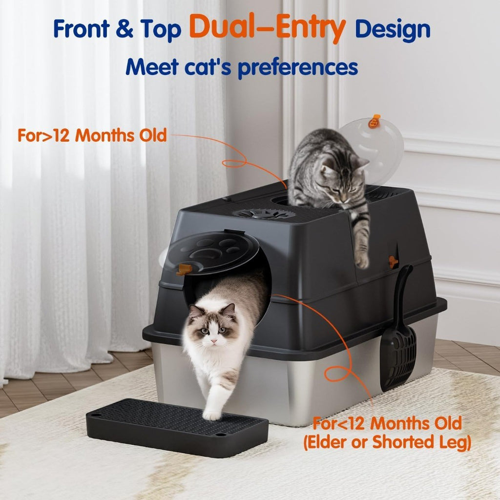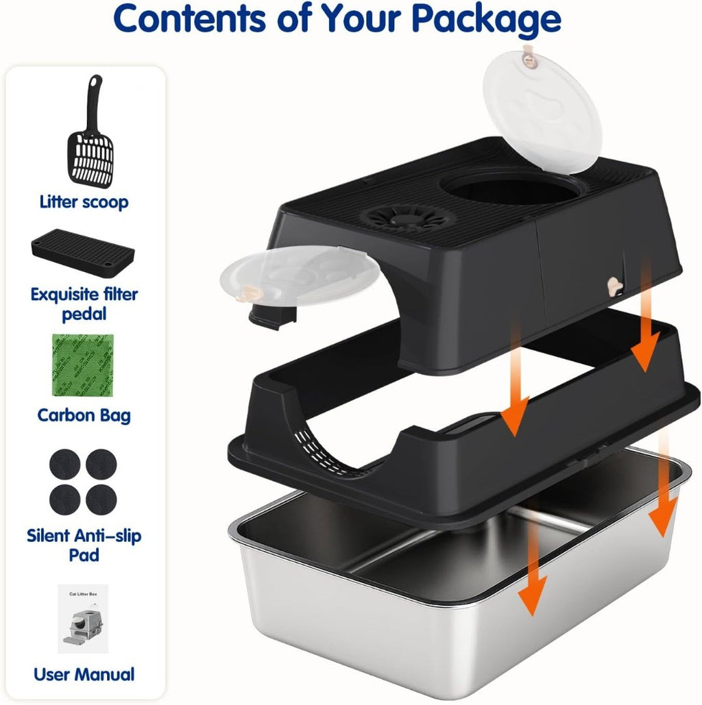 Citylife Stainless Steel Cat Litter box with Lid, Large Enclosed Metal Cat Litter Tray with Scoop & Steps, 120°Flip-top, Easy Clean, Non-Sticky, Non-Odor, Black